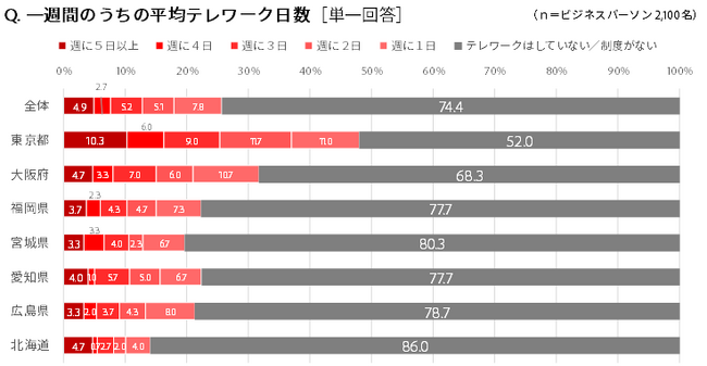 ビジネスパーソンの現在の勤務状況については、テレワークを非実施が全体の74.4%となりました。地域別でみると、テレワーク実施者は東京都(48.0%)が最も多く、北海道(14.0%)が最も少なく、ここでも3倍以上の差があります。地域別で比較するとコロナ禍から3年以上が経過した今でも、東京都が他の道府県に比べ、テレワークを継続していることが分かりました。テレワークを実施している人の平均テレワーク日数は約2.67日/週になり、週の半分以上でテレワークを実施している結果になりました。
