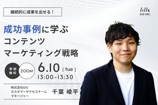株式会社GIGは、成功事例をもとに「継続的に成果を出せるコンテンツマーケティング戦略」を解説するウェビナーを、6/10(火)に開催します。参加費無料、事前登録制。