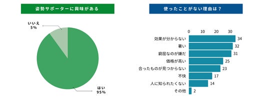 また、姿勢サポーターを使用したことがないと答えた25%のうち、実際には95%の人が使用してみたいと考えていることも分かりました。これまで使用しなかった理由としては、「効果が分からない」という回答が最も多く、その次に「暑い」「窮屈なのが嫌だ」といった回答もありました。
