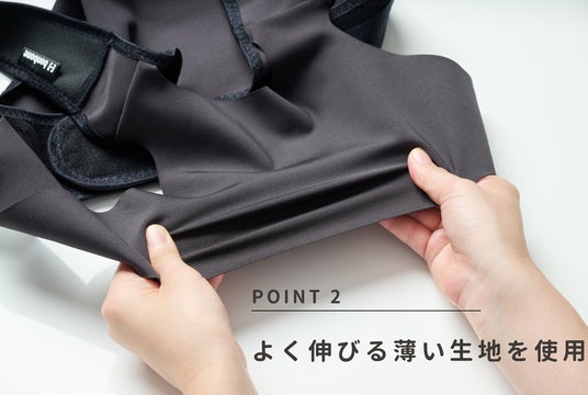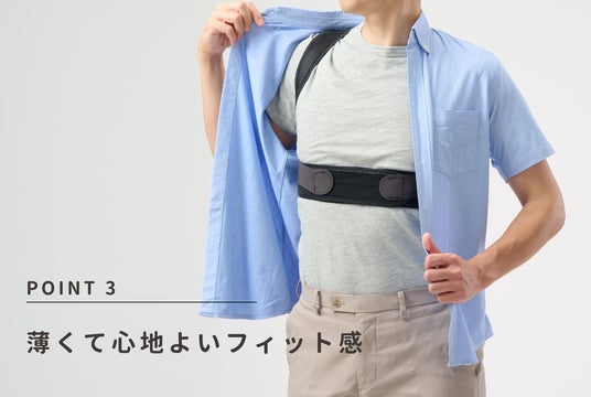 柔らかくてよく伸びる、薄い生地がぴったりフィットします。身体を無理に固定せず、日常生活に必要な筋肉を動かしながら丸まった背筋を伸ばします。