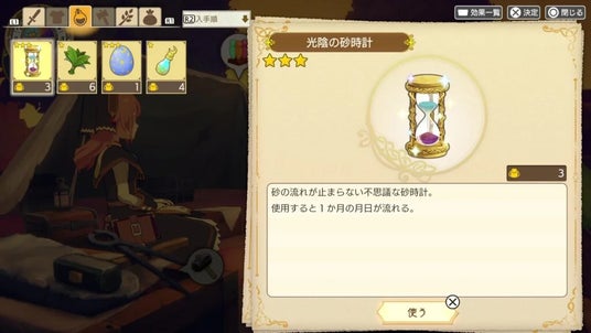 「光陰の砂時計」使用するとゲーム内時間が1か月進みます。