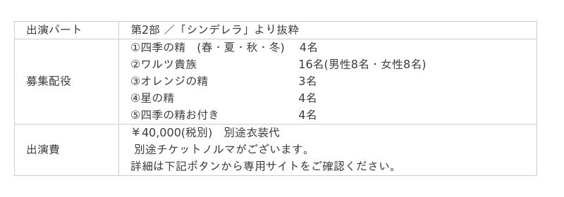 世界トップクラスのプロダンサーとともに過ごし舞台で共演を果たす「未来のプロダンサー=出演ダンサー」を募集しています。この公演は、お教室・地域の垣根を越えてご出演いただける公演で、年齢や性別を問わず、日本でバレエの練習に励んでいる生徒さんを幅広く募集しています。
