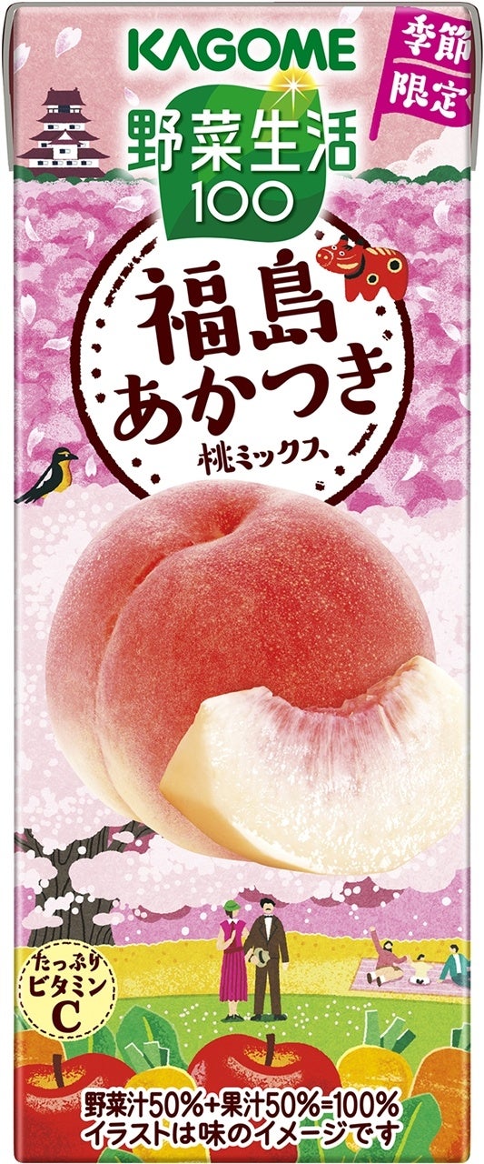 「野菜生活100季節限定シリーズ」から新たに発売する「野菜生活100福島あかつき桃ミックス」は、福島県の昼夜の寒暖差の中で育つ、しっかりとした甘さと程よい酸味の福島県産のあかつき桃の味わいの野菜・果実100%ミックスジュース※1です。あかつきの名前の由来は、果皮の美しい赤色と、福島の桃の中では早期に収穫できることから「夜明け」という意味を込めて名付けられた説と、福島の伝統行事のひとつである「信夫三山暁まいり」に由来している説などがあります。砂糖不使用で、たっぷりビタミンCを摂ることができます。朝食のおともや、リフレッシュしたいときにおすすめです。