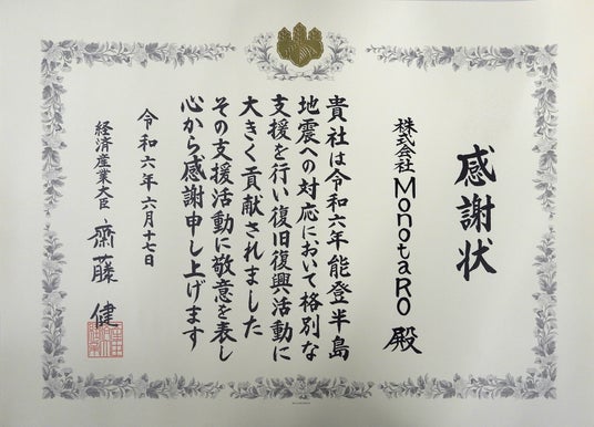現場を支えるネットストア「モノタロウ(https://www.monotaro.com/)」を運営する株式会社MonotaRO (本社:大阪府大阪市、代表執行役社長:田村 咲耶、以下 モノタロウ) は、2024年6月17日(月)、令和6年能登半島地震に対応した貢献企業として、経済産業省より感謝状を授与されました。