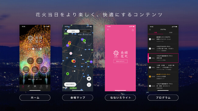 2017年にローンチした長岡花火公式アプリは、長岡花火に参加するユーザーをメインターゲットとした、大会がより楽しく便利になるアプリです。花火の鑑賞を妨げるものを取り除くとともに、より彩りある思い出を作ってもらえるよう設計しています。