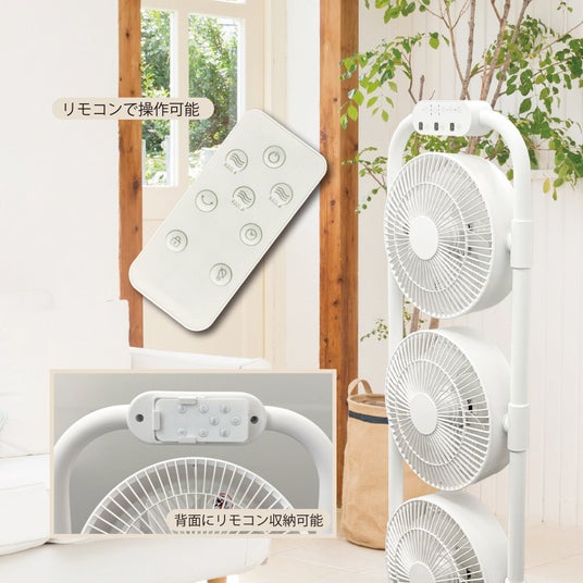 1台のリモコンで3つのファンをコントロール。リモコンは本体背面に収納可能です。