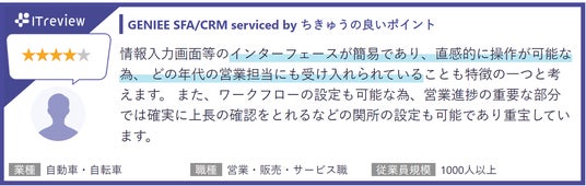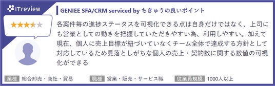 今回の「ITreview Grid Award 2024 Fall」は2024年9月までに掲載されたレビューの集計結果をもとに選定されています。「GENIEE SFA/CRM」を活用した営業進捗の可視化による社内での情報共有や会議の質改善に関する高評価のコメントが多く寄せられました。