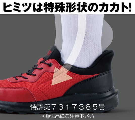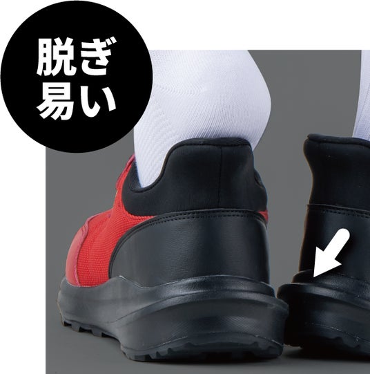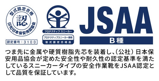 今回発売されるスパットシューズ軽作業靴(プロテクティブスニーカー)は「スパッと履ける」便利な機能性はそのままに、(公社)日本保安用品協会が定める「JSAA B種」の基準をクリアしたスニーカーです。