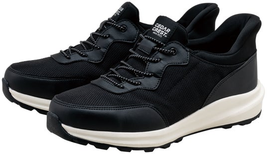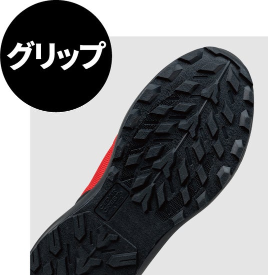 シューズの先端は、重いものが落ちてきても大丈夫なように、鋼製先芯を装着してつま先をプロテクト。その他にも、かかと部分に突起を設けることにより脱ぎ易い形状にし、通気性の良いハニカム形状のインソールを採用。アッパーにはっ水加工を施し、滑りにくいアウトソールで地面をしっかりグリップします。