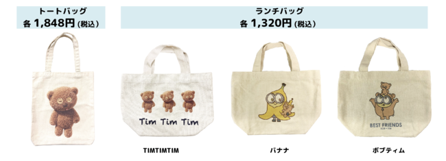 POP UP限定デザイングッズはもちろんバナナを愛するミニオンたちの世界観がたっぷり詰まった商品を多数販売。『怪盗グルー/ミニオンズ』シリーズに登場するミニオンたちの中で、とっても優しくてひとなつっこい性格のボブと、彼にとってくまのぬいぐるみの相棒ティムの商品をたくさん用意しています。