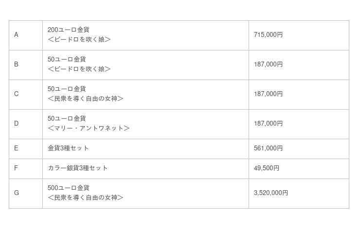 ずっしりと金の重さを感じるフランス発行の5オンス(約156g、500円硬貨の約22倍の重さ)金貨が登場するほか、女性たちに焦点を当てて描かれた名作をモチーフとした、金貨と銀貨7種類をラインナップしております。