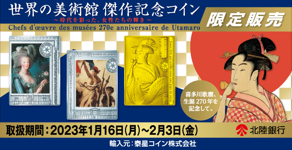 2023年に生誕270年を迎える喜多川歌麿の代表作を筆頭に、時代を彩った女性たちを描いた名作がデザインされたコインを集めた「世界の美術館傑作記念コイン」をご案内いたします。