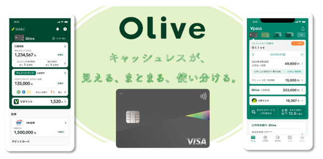 2023年3月からスタートした「Olive(オリーブ)」は、銀行口座、カード決済、ファイナンス、オンライン証券、 オンライン保険などの機能を、アプリ上でシームレスに組み合わせた新しいサービスです。三井住友銀行アプリ、三井住友カードのVpassアプリの双方から各種サービスへのアクセスが可能となり、日常的な決済や資産形成・運用等の各種サービスの残高や明細をまとめて管理することができます。また利便性だけでなく、Oliveアカウントで給与を受け取れば毎月一定額のVポイントの付与、振込手数料が無料になるなど、各サービスの利用状況に応じたポイントアッププログラムをご用意しておりますので、お得にポイントを貯めて無駄なく使うことができます。また、1枚のカードでキャッシュカードとクレジットカード、デビットカード、ポイント払いの機能をアプリで切り替えできる「フレキシブルペイ」を搭載し、カードはナンバーレス仕様のため安心・安全にご利用いただけます。