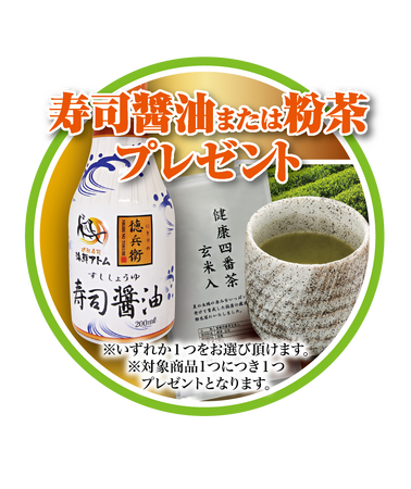 事前予約いただくと『寿司醤油』 または『粉茶(健康四番茶玄米入り)』をいずれかプレゼントいたします。