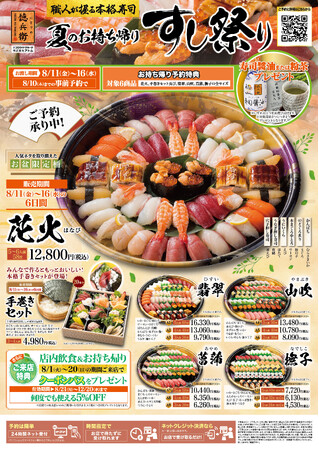 今年のお盆は、本まぐろ中とろ、のどぐろ炙り、かんぱちなどの豪華ネタ満載のお盆限定桶「花火」と、人気の寿司ネタ、海苔、シャリがセットになった「手巻きセット」が新登場!お盆の楽しいひと時を豪華なお寿司が華やかに食卓を彩ります。