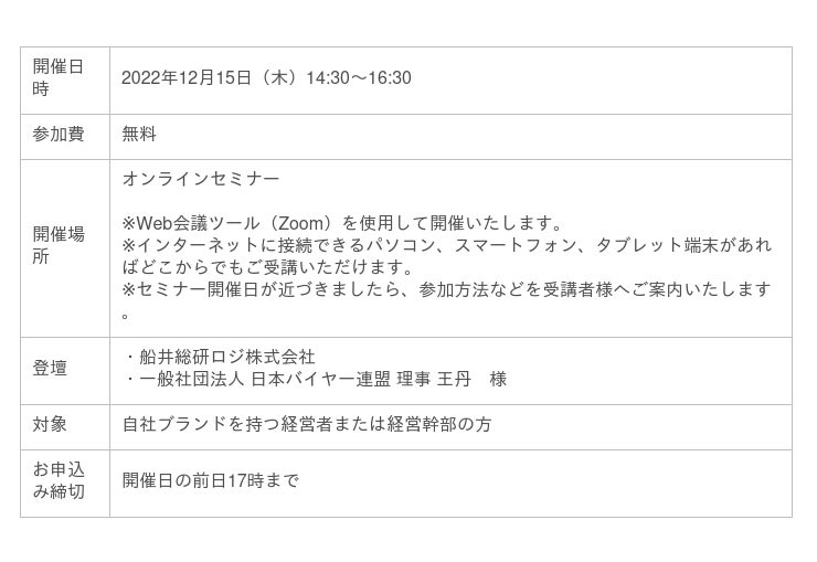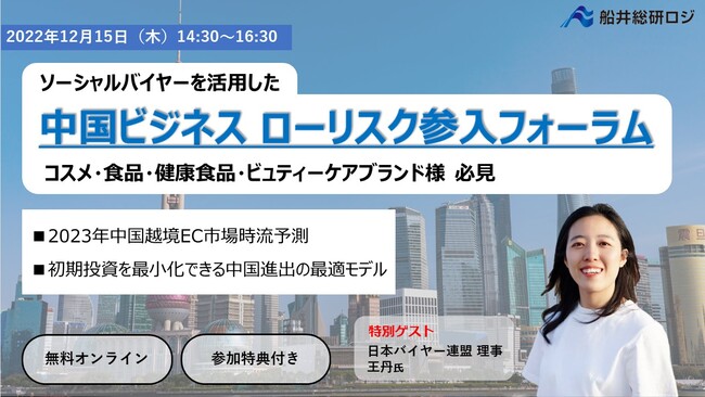ロジスティクス・物流コンサルティングサービスを提供する船井総研ロジ株式会社(東京本社:東京都千代田区、代表:菅重宏、以下「船井総研ロジ」)は、2022年12月15日(木)14:30~16:30にコスメ・食品・健康食品・ビュティーケアブランド企業を対象にした無料セミナー「ソーシャルバイヤーを活用した中国ビジネスローリスク参入フォーラム~2023年中国越境EC市場時流予測&初期投資を最小化できる中国進出の最適モデルを徹底公開~」をオンラインで開催いたします。