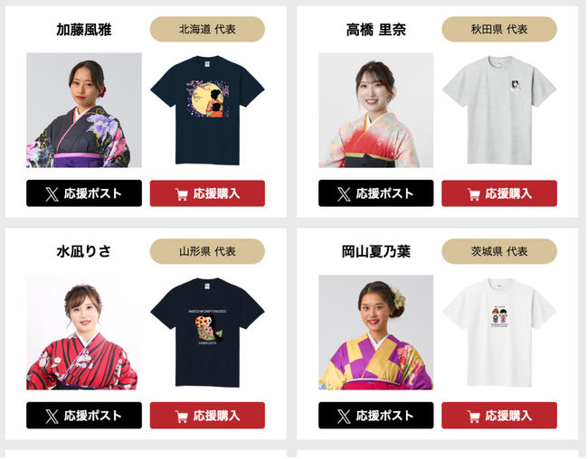 なでしこ日本2023のファイナリストによるオリジナルデザインで彩ったTシャツの販売バトルが開催されます。それぞれ上位5名に輝いた参加者は渋谷の大きな街頭ビジョンに出演ができます。販売されるTシャツは本イベントのためにそれぞれ描き上げたデザインで、コンテストで見せる「和」の装いとは、また異なった個性の光るものとなっています。あなたの応援で大きなビジョンに推しを出演させよう!