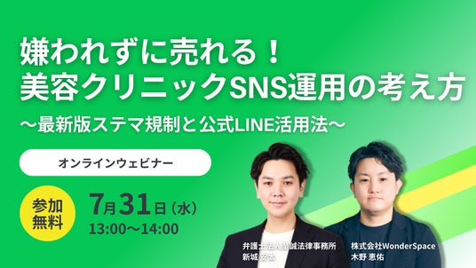株式会社WonderSpace(本社:東京都港区、代表取締役社長:山本 尚宏)は、弁護士法人至誠法律事務所(本所:東京都千代田区、代表弁護士:齋藤 健一郎)の新城弁護士と『美嫌われずに売れる!美容クリニックSNS運用の考え方~最新版ステマ規制と公式LINE活用法~』をテーマにした共催ウェビナーを開催いたします。