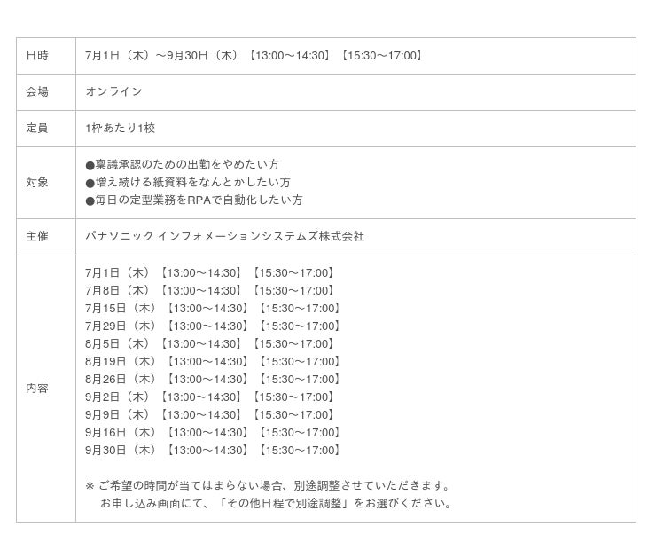 パナソニック インフォメーションシステムズ株式会社は、2021年7月から9月の毎週木曜日に、教育現場のバックオフィス業務に関する個別相談会を開催します。