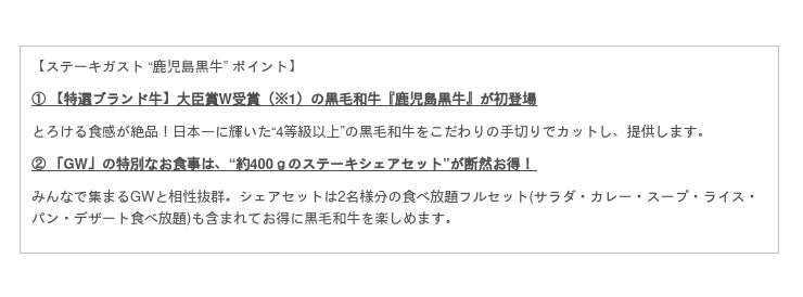 株式会社すかいらーくレストランツ(本社・東京都武蔵野市、代表取締役社長 中島 尚志)が運営するステーキガストでは、2023年4月27日(木)より、『鹿児島黒牛』を使用したサーロインステーキの販売を開始いたします。