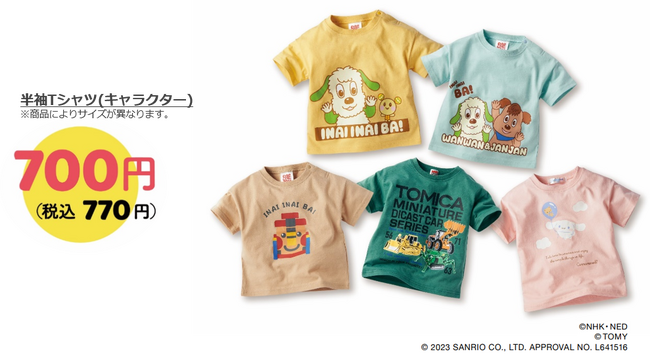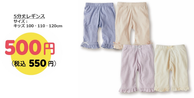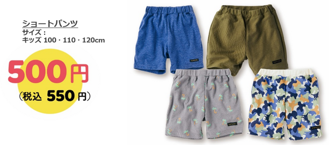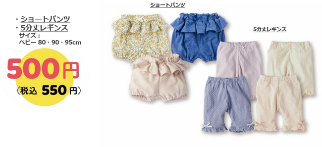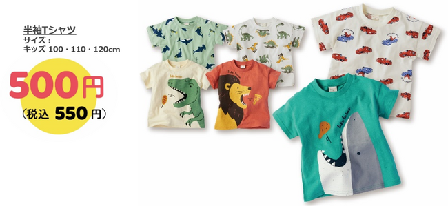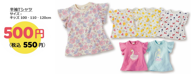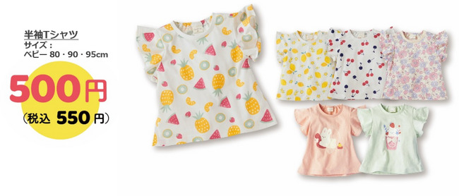 500円(税込550円)均一のかわいいデザインの半袖Tシャツとボトムス各種もご用意しています。