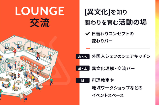 もう一つはラウンジスペースを活用し、異文化を知り関わるきっかけとなる様々なコンセプトの場を運営していきます。