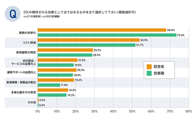 DXの期待される効果として経営者は「業務の効率化」(68.0%)、「コスト削減」(53.9%)、営業職も「業務の効率化」(73.4%)、「コスト削減」(51.7%)と続き、DXへの期待効果は一致している。