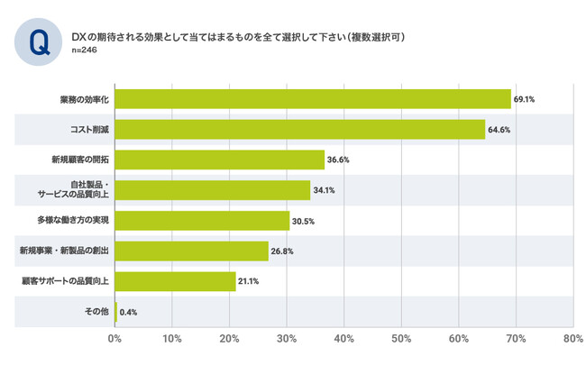 DXの期待される効果としては「業務の効率化」(69.1%)、「コスト削減」(64.6%)が上位を占める。次いで「新規顧客の開拓」(36.6%)や「自社製品・サービスの品質向上」(34.1%)とDXによる売上創出のための活動への期待が続いた。