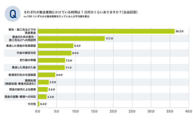 集金業務にかけている1日あたりの時間の平均は1位「客先・施工先などでの現金集金」(36.2分)、2位「集金のための客先・施工先などへの再訪問」(17.7分)、3位「集金した現金の有高確認」(9.4分)と続く。特に時間が割かれている「客先・施工先などでの現金集金」を1か月(20営業日)で換算すると、1か月あたり約12時間をその作業に充てていることがわかった。