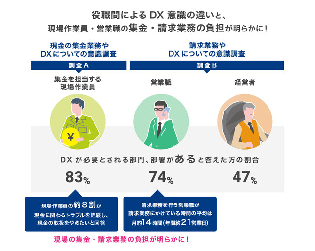 今回は、現金の集金業務(客先への訪問集金など)に携わる現場作業員を対象とした調査(「現金の集金業務やDXについての意識調査」(以下調査A))と、国内の企業で請求業務(請求、入金管理や督促など)に携わる経営者や営業職を対象とした調査(「請求業務やDXについての意識調査」(以下調査B))の2つの調査結果を公開いたします。