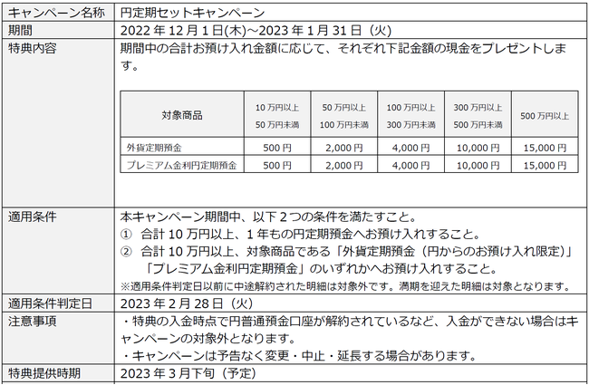 1年もの円定期預金に合計10万円以上お預け入れすることに加えて、対象商品(外貨定期預金、プレミアム金利円定期預金)のいずれかへ合計10万円以上をお預け入れすると、預け入れ金額に応じて商品ごとに最大15,000円、全商品合計で最大30,000円をもれなくプレゼントします。