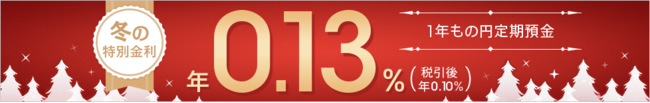 キャンペーン期間中の1年もの円定期預金の新規お預け入れに対して、年0.13%(税引後 年0.10%)の特別金利を適用します。