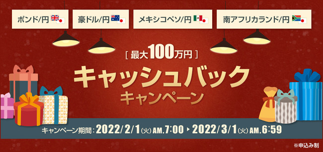 GMOインターネットグループのGMOフィナンシャルホールディングス株式会社の連結会社で、金融商品取引業を営む株式会社FXプライムbyGMO(代表取締役社長 安田和敏、以下FXプライムbyGMO)は、2022年2月1日(火)午前7時より、最大1,000,000円の4通貨ペア(ポンド/円、豪ドル/円、メキシコペソ/円、南アフリカランド/円)のキャッシュバックキャンペーンを実施することを決定いたしました。