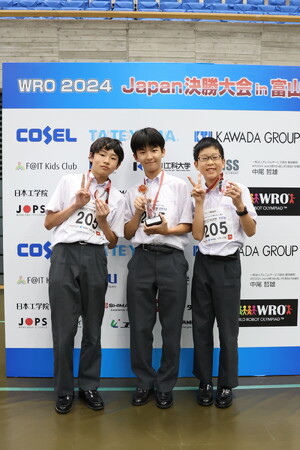 同部門に出場した日比惺士朗さん、西原寿柾さん(中学3年)と秋山奨さん(中学1年)は、高い技術で課題を達成したことに加え、エクストラチャレンジにおいても、独創的な解決方法で高得点を獲得し、地区予選を勝ち抜いた170チーム中3位になり世界大会の出場を決めました。