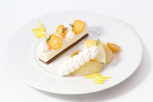 柚子のクーリを忍ばせたフロマージュムースに金柑のコンポート、ほうじ茶のクッキー生地で組み立てたアシェットデセール(皿盛りデザート)。