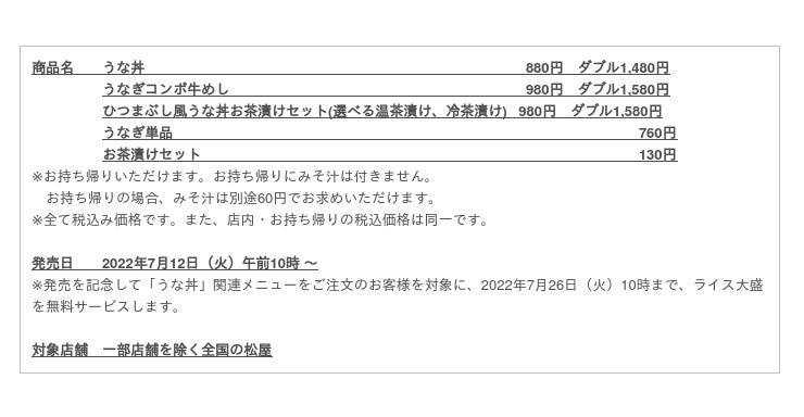 このたび松屋フーズ(本社:東京都武蔵野市、代表取締役社長:瓦葺一利)では、牛めし・カレー・定食・その他丼の「松屋」におきまして、2022年7月12日(火)午前10時より「うな丼」関連メニューを発売いたします。