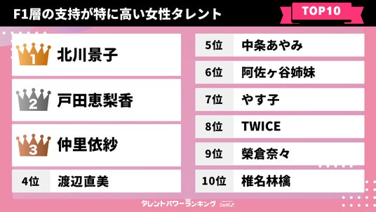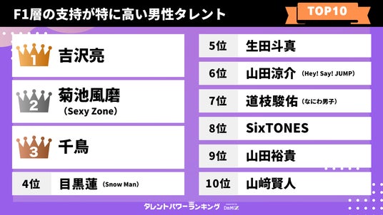 『タレントパワーランキング』では、タレントパワーランキングに登録されている男性タレント&女性タレントについて、F1層(20~34歳女性)が回答した結果のスコアを調査。