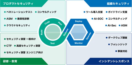 平時のセキュリティ対策である各種脆弱性診断やコンサルティングから有事のセキュリティ対策であるフォレンジックや事後対応を提供するとともに、生成AIの利用に関するセキュリティコンサルティングやAIを用いたSOCの自動化、ASM、AI Monitoringを提供しています。