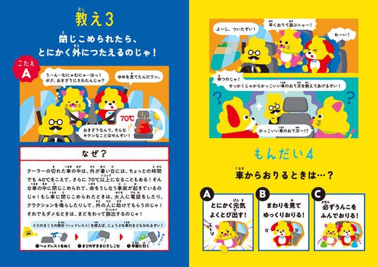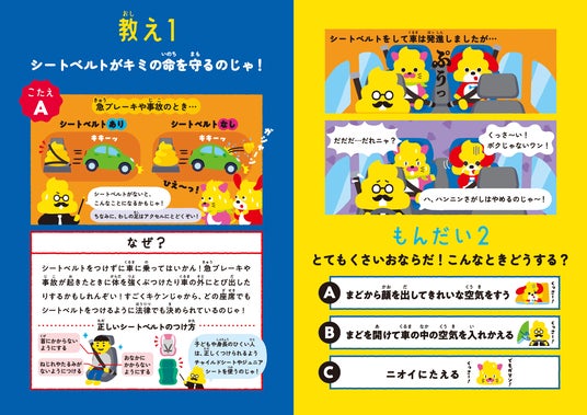 クイズをつうじて、車に乗るときはシートベルトをきちんとつけること、もし車の中に閉じ込められたらどう対処したら良いかなど、車に乗るときに必要な知識をクスッと笑いながら楽しく学べる仕組みになっています。