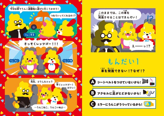 冊子の内容はクイズ形式で全5問。車の中で起こるトラブルを通して、うんこいぬとうんこねこが、車の中での過ごし方、気をつけることに関する問題を解いていくストーリー展開です。「うんこ」というキーワードがちりばめられたユーモアあふれるクイズの設問や選択肢はもちろん、シュールで可愛らしいイラストとテンポよく展開されるストーリーが、子どもの興味関心を惹きつけます。