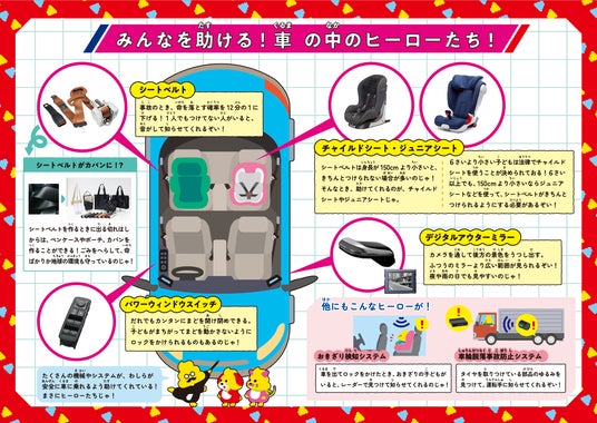 冊子の巻末では、東海理化が自動車の安全性向上のために開発している製品の一部をイラスト付きで紹介しています。「安全」を支える仕組みを子どもたちにもわかりやすく伝え、未来の社会を担う子どもたちに「安全」の大切さを意識してもらうことを目指しています。