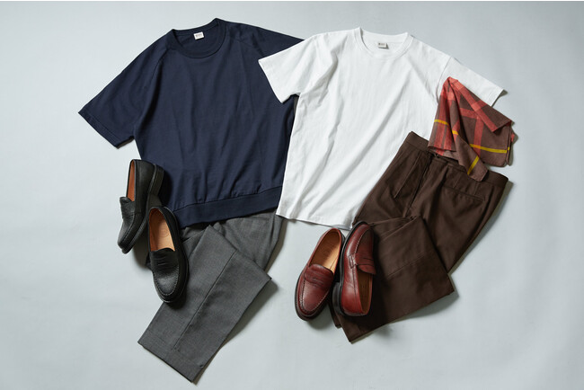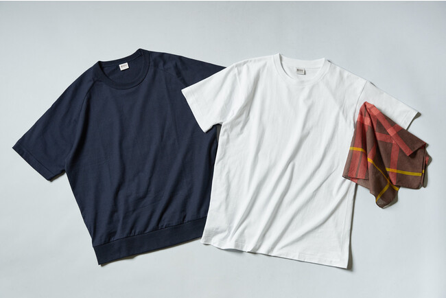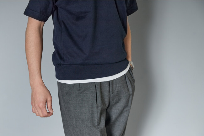 「ただプロダクトをセット売りするだけでなく、コーディネート提案まで含めて企画するあたりがスタイリスト発らしいのではと思っています。ネイビーのアウターTは、“スウェット風のTシャツ”をイメージして作りました。最近はトラッドブームの影響で大人のスウェットが定着しつつありますが、いま気になっているのが夏にも着られる半袖スウェット。ただ、アメカジスウェットだと少々ラギッドすぎるので、大人が着られるバランスのものがあるといいなと考えていたんです。そこでこのアウターTでは、40番手という繊細な糸を使った厚すぎない生地を採用。ラグランスリーブやゆとり感のあるシルエットなどスウェットのテイストを活かしつつ、大人の上質さを表現しました」(四方さん)