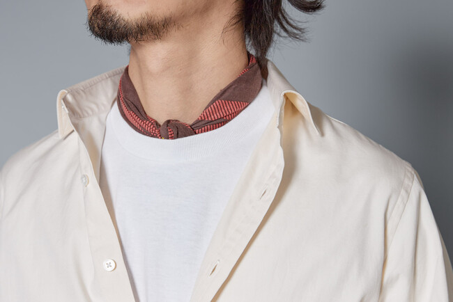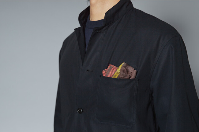 「サイズを大きくしたぶん、できるだけ薄い素材をチョイスしているのがポイントです。イメージしたのは、洗い込まれたヴィンテージバンダナの風合い。大判でもくたっとしているので、胸ポケットに入れた際にボリュームが出すぎず、またニュアンスづけもしやすいんですよね。そこで今回は、40番単糸のコットンガーゼ生地を採用しました。ご覧のとおり、シャツジャケットなどカジュアルなアウターにもよく合いますよ」(四方さん)