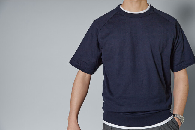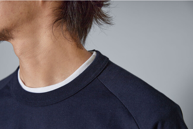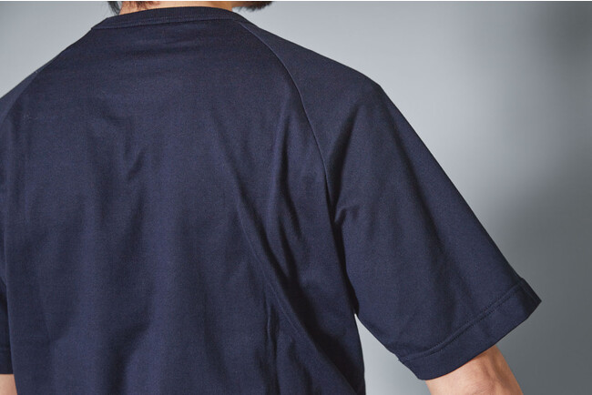 Tシャツで一般的なセットインスリーブではなく、ラグランスリーブを採用しているのも特徴。「スウェットからのインスピレーションですが、ラグランは英国コートの定番でもあるので、ブリティッシュテイストにも繋がるディテールだと思います」と四方さん。袖口は2本針でステッチをかけることにより、アウターTとしての存在感を高めています。