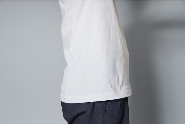 いっぽう、白のインナーTはフィット感を重視して重ね着してもゴロつかないようデザイン。生地もアウターTより薄手のものを採用しています。とはいえピタピタのタイトフィットにはせず、適度なゆとりも残しました。着心地の良さをキープするとともに、インナーTを1枚で着ても下着のように見えないよう配慮しています。