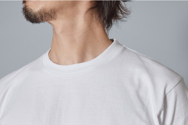 インナーTは素肌に直接当たることを考慮し、着心地の柔らかさを縫製面でも追求。サイドシームのない丸胴編みを採用することで、ゴロつきを解消しています。また首や肩周りは縫い目に身頃と同素材でテープ処理を施す“タコバインダー”仕様に。型崩れを防ぐとともに、縫い目のアタリを柔らかくする効果も狙っています。