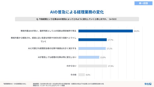 AIに任せたい業務としては、「入力ミス・重複・不正などの自動チェック・アラート」(49.1%)、日々の仕分入力の自動化(34.6%)、「領収書や請求書の読み取り・データ化(OCRなど)」(31.7%)などの定型業務の効率化への期待が上位に挙がりました。また、今後AIが普及したとしても、「単純作業はAIが担うが最終判断として人の役割は現状維持で残る」(34.0%)、「単純作業から解放されより経営に近い高度な判断や分析を担う役割へシフトしていく」(17.7%)といった回答が多く、経理担当者自身の価値が失われるとは捉えられていない実態が明らかになりました。
