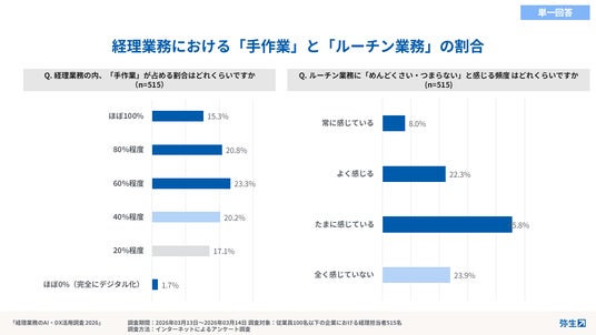 弥生株式会社(本社:東京都千代田区、代表取締役 社長執行役員 兼 CEO:武藤健一郎、以下「弥生」)は、年度末を迎え、多くの企業で経理の役割や重要性があらためて意識される3月31日を「経理の日」として制定しています。その制定社である弥生は、「経理の日」にあわせ、経理業務を取り巻く環境や意識がどのように変化しているのかを明らかにするため、従業員100名未満の中小企業に勤める経理担当者515名を対象に、「経理業務のAI・DX活用に関する実態調査」を実施しました。