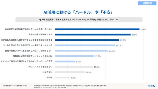 経理業務へのAIツール導入率は約2割とまだ限定的な結果となりました。また、導入済み企業の6割が、自社のAI活用度を「60点以下」と評価しており、導入はしているが活用・成果には直結していない実態が浮き彫りとなっています。AI活用における課題としては、「最終確認は人が必要で信用しきれない」(33.4%)、「結局、人が全件チェックしており手間が減らない」(25.4%)といった声が多く挙がりました。