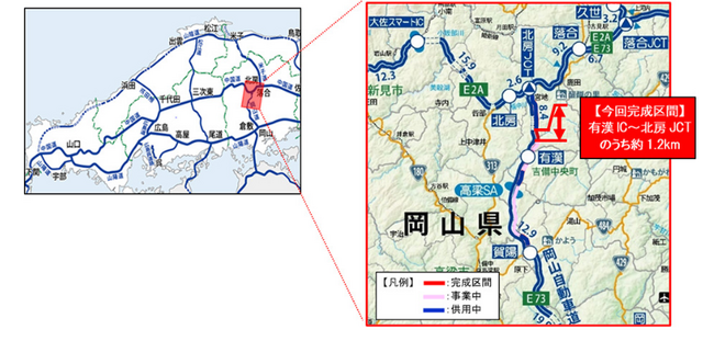 NEXCO西日本中国支社(広島市安佐南区、支社長:赤松 邦康)にて進めてまいりましたE73岡山自動車道 有漢(うかん)IC~北房(ほくぼう)JCT間(延長:約8.4km)のうち、高梁(たかはし)市有漢(うかん)町付近の延長約1.2kmの4車線化工事が、令和5年8月9日(水曜)15時に完成します。